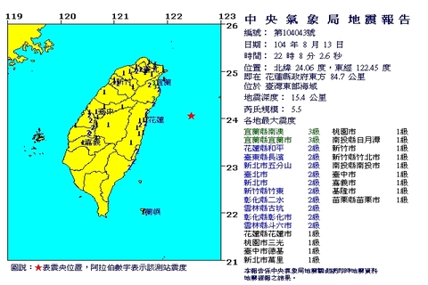 【新唐人亞太台 2015 年 08 月 13 日訊】今(13日)晚間10點08分,發生芮氏規模5.5地震,震央位在花蓮縣政府東方84.7公里,深度只有15.4公里。全台最大震度在宜蘭3級,花蓮2級,台東、台北、新竹、彰化、雲林縣2級,桃園、台中、南投、嘉義、苗栗等縣震度1集。