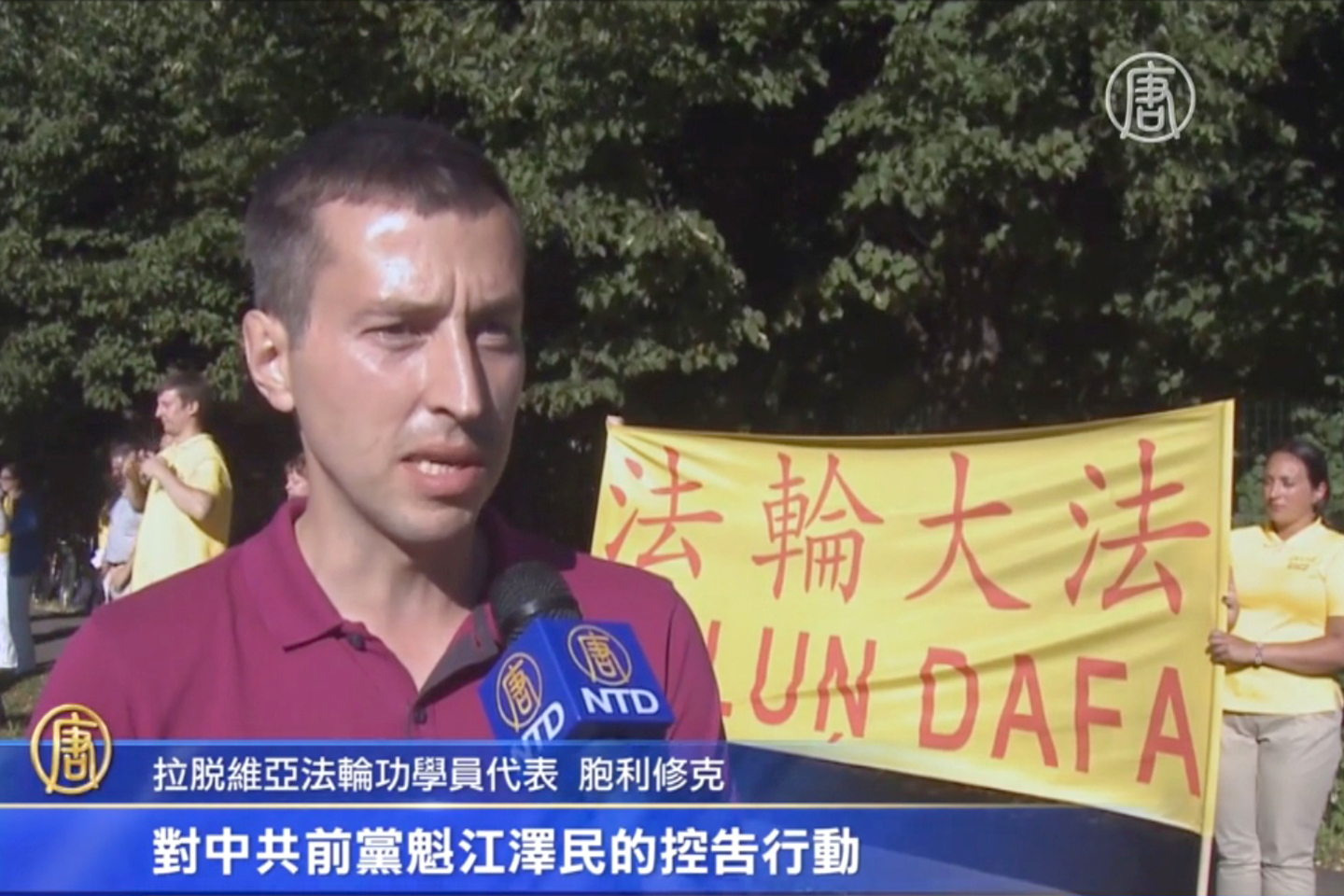 拉脫維亞法輪功學員代表阿納托利.胞利修克:「我們支持眾多中國民眾控告中共前領導人江澤民的行動。」