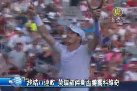 【新唐人亞太台 2015 年 08 月 17 日訊】體壇消息,再來看到,英國希望,網球名將莫瑞,今天終結對球王喬科維奇的八連敗,他在羅傑斯盃決賽中,以6-4、4-6、6-3的成績,擊敗喬帥封王,這是莫瑞2年多來,對喬科維奇的首勝。也是莫瑞生涯第35冠。而喬科維奇,則是累計已經拿到24座大師賽錦標。外媒報導,喬科維奇說:「人從來都不喜歡輸,但任何連勝到最後都會終止。」