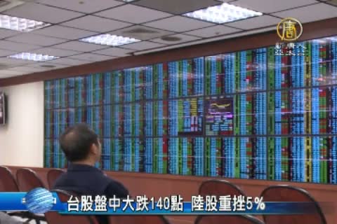 【新唐人亞太台 2015 年 08 月 19 日訊】來關心股市,今天台股、陸股都出現大跌。台股今天盤中大跌超過140點,不論金融、科技或傳產股都呈現疲弱走勢,8000點大關岌岌可危,創下23個月波段新低。而中國股市方面,昨天暴跌6%,今天一開盤再度大跌,上證指數開盤跌2.7%,盤中跌幅一度擴大到5%,市場上傳出,中國當局退出救市的疑慮升高,導致陸股再次急轉直下。