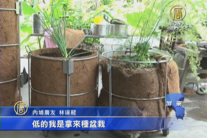 內埔農友 林達龍:「低的我是拿來種盆栽,種菜的話我是用這個,高層次種法,立體式種法,我們的菜,我們的培育土放在裡面,然後我們這個菜從這邊旁邊種,它有受光的功能它可以旋轉。」