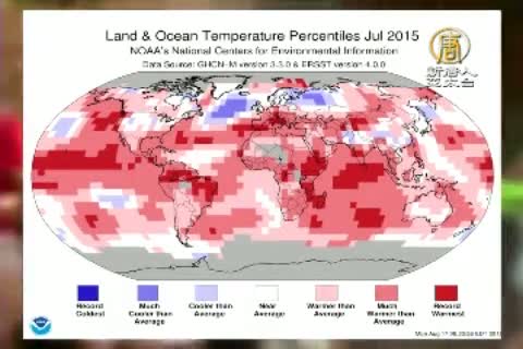 【新唐人亞太台 2015 年 08 月 21 日訊】今年夏天,地球熱壞了,因為資料顯示,今年7月全球的陸地和海洋表面溫度,平均達到攝氏16.61度,比20世紀的平均氣溫,高出0.81度。今年的前7個月,全球各地的氣溫都出現新高,可能讓2015年成為有紀錄以來最熱的一年。美國海洋與大氣管理局也預測,今年可能會出現超強的「厄爾尼諾現象」,讓太平洋增溫超過攝氏2度。