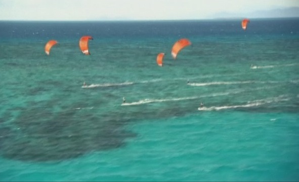 湛藍的海面,白色的沙灘,天空中點綴著橘色的風箏,衝浪手們在海上帶起一道道白色浪花。八位風箏衝浪手將用十天的時間,衝浪1000公里穿越大堡礁。