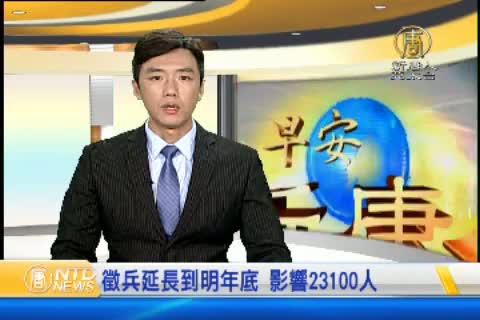 【新唐人亞太台 2015 年 08 月 26 日訊】國防部原本規劃在民國105年底,要達成全募兵制目標,3月時還宣布今年實施最後一次徵召,明年起不再徵召義務士兵。不過,國防部昨晚宣佈,因為評估募兵人數仍未達目標,加上區域情勢升溫,因此義務役的徵兵,要延長到明年年底,預計有2萬3千1百人受到影響。