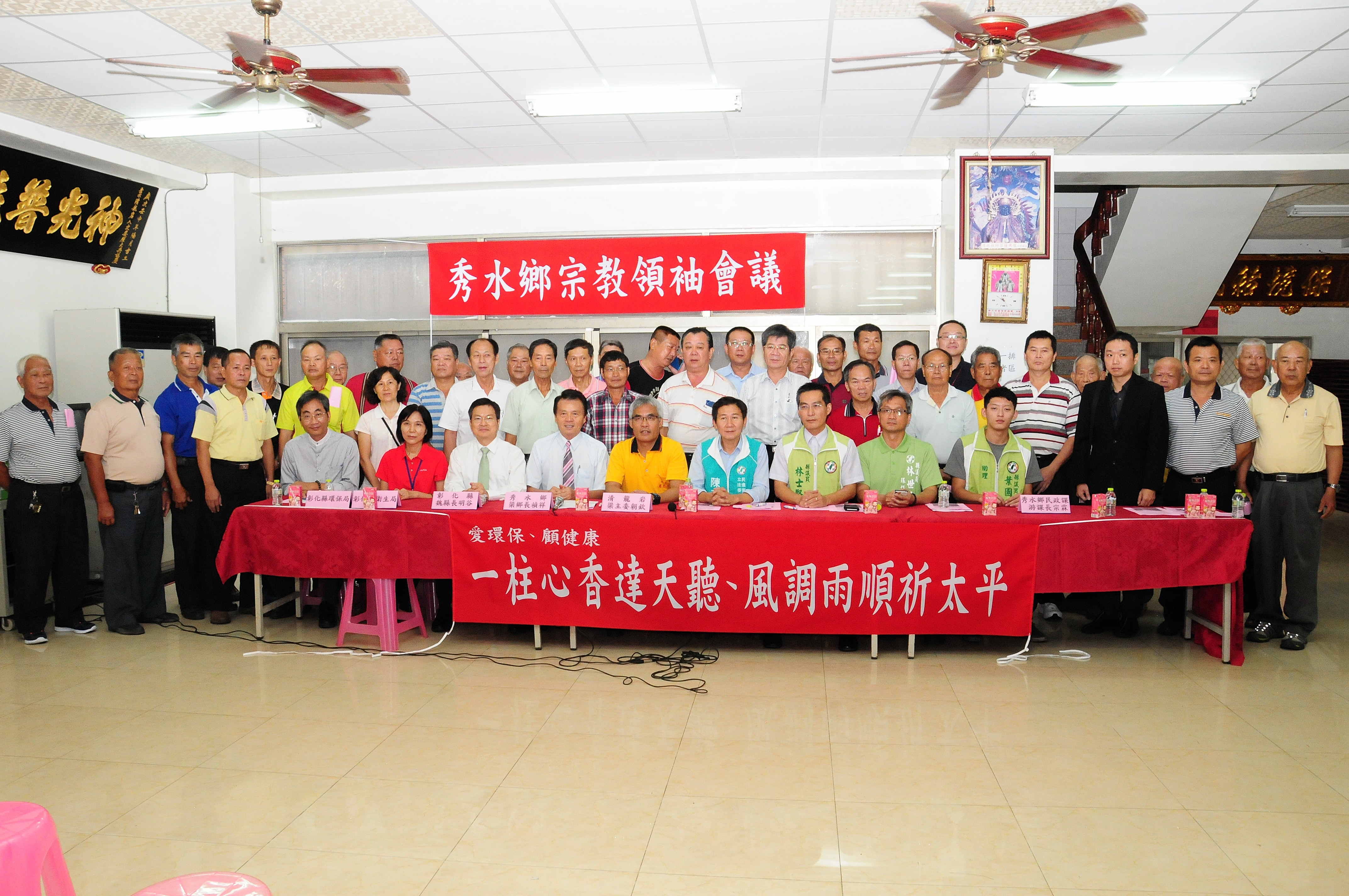 【新唐人亞太台 2015 年 08 月 26 日訊】為響應彰化縣政府推動「心香祭拜不燒金不焚香」政策,秀水鄉公所26日上午在清龍岩舉辦「愛環保顧健康」秀水鄉宗教領袖會議,除彰化縣長魏明谷和秀水鄉長梁禎祥出席外,23間宮廟主委、14村村長也共同連署響應,致力推動環保祭祀、減少燒紙錢、放鞭炮,守護彰化縣的空氣品質,也維護縣民的健康。
