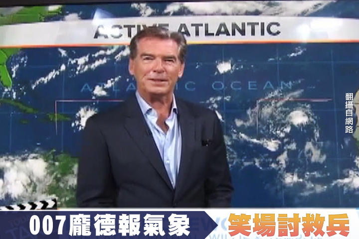 【新唐人亞太台 2015 年 08 月 27 日訊】電影《007》中總是帥氣英雄形象出現的「龐德」皮爾斯布洛斯南 ,這回挑戰擔任氣象主播,果然隔行如隔山,一開始還有模有樣的看著螢幕說故事,但是當需要深入講解天氣動向時便手足無措,眼看就要開天窗,立刻向一旁的專業氣象主播求救。