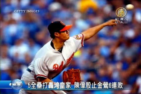 【新唐人亞太台 2015 年 08 月 27 日訊】旅美左投陳偉殷在台北時間上午8點多,先發迎戰美聯戰績最佳的皇家隊,陳偉殷主投6.2局,被敲出10支安打,失3分,送出4次 三振,在隊友轟出5發全壘打的掩護下,金鶯終場8比5擊敗對手,止住了6連敗,陳偉殷同時取得個人本季第8勝。