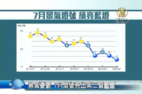 【新唐人亞太台 2015 年 08 月 27 日訊】財經消息來看到,國發會今天公布7月景氣燈號,綜合判斷分數為14分,較上月減少2分,燈號持續呈現低迷的藍燈;景氣領先指標和同時指標都下跌,顯示國內經濟成長力道偏弱。國發會說,預計要等到第4季,狀況才會明顯好轉。