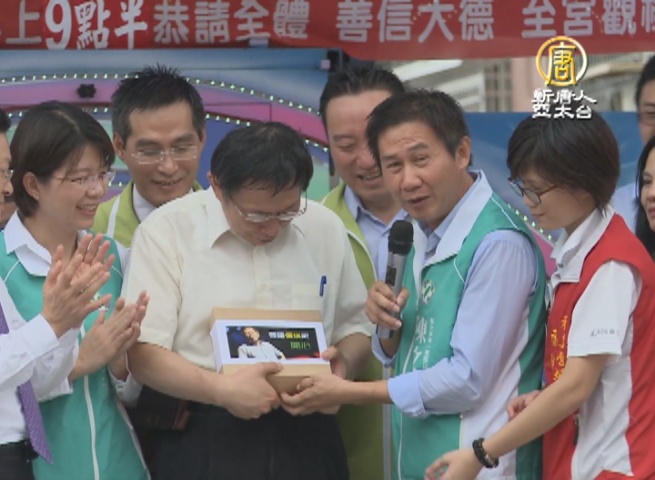 【新唐人亞太台 2015 年 08 月 30 日訊】台北市長柯文哲今天(30日)參訪彰化和美,柯P問了菜販業者很多問題,最後,立委參選人陳文彬送上「禮物」,說要讓「佩琪姊姊」更開心,原來是紡織業者的紗線 , 品質優良,成就台灣服飾產業的口碑。