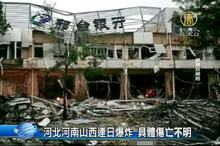 2016-07-22 12:48:31中國山西、河北、河南最近接連發生爆炸事故,山西的 國有北化關鋁 化工公司的炸藥生產線19日晚間 發生爆炸,據傳有7人死亡,但因為這家公司屬於軍事工業企業,是機密單位,不方便透露具體傷亡人數。而在河北 邢台市 橋東區鳳凰城小區的一間銀行,前天清晨也發生爆炸,初步調查是天然氣管路漏氣造成,據媒體報導,造成7人輕傷,沒有人死亡。另外,昨天晚上,河南鄭州新力電廠熱力管發生爆炸,事後電廠保安表示,沒有人員傷亡及財產損失。