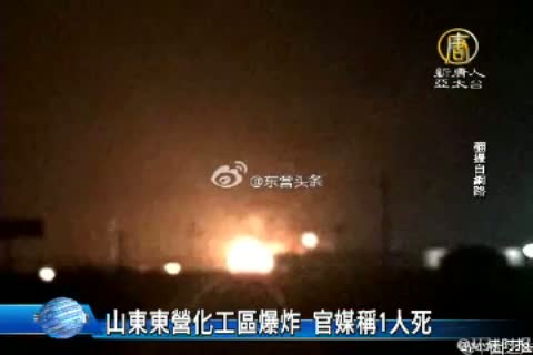 2015-09-01 07:02:30早安新唐人,首先帶您關心,中國再傳化工爆炸。地點在山東省 東營 的1個化工區。中共環球時報官方微博消息,昨天深夜11點25左右,山東東營 利津縣 刁口化工區周圍發生爆炸,從畫面中可以看到,火光高達數十公尺高,濃煙直冒,隨後的衝擊波威力驚人,有關爆炸的威力及影響範圍,以及釀成的傷亡數字,截至目前,外界仍無法得到消息。這是中國繼8月12號的天津爆炸事件,及8月22號山東淄博的潤興化工廠傳出爆炸事件後,又一起爆炸事故。