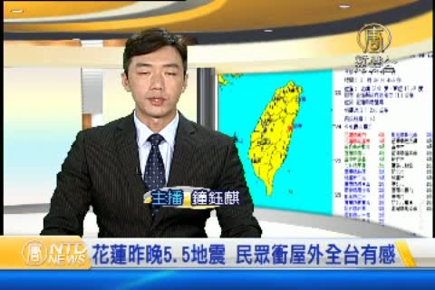 【新唐人亞太台 2015 年 09 月 02 日訊】昨天,高雄與花蓮都出現地牛翻身。尤其是花蓮在晚上9點24分 、出現規模5.5的地震,震源深度只有20.3公里,最大震度有6級,出現在花蓮縣 銅門,全台有感。當地民眾形容,當時感覺 咚的一聲,以為發生爆炸,接著搖晃時間長達10秒,有人嚇的衝出屋外,充分感受到地震威力。