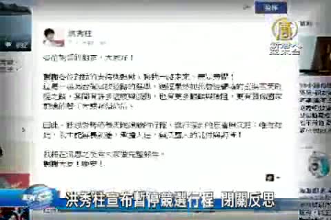 【新唐人亞太台 2015 年 09 月 03 日訊】國民黨總統參選人洪秀柱昨天晚上在臉書上宣布暫停競選行程。洪秀柱的幕僚否認她要退選,或改為參選副總統。洪秀柱感謝各界對她的支持與鼓勵,但決定暫停每天如「陀螺」般的行程,要進行深刻的反省與沉思,之後會做完整報告。外界猜測,是否暗示洪將退選,或退居二線 改選副總統?幕僚都否認,只說純粹是調整步伐,今天上午洪辦發言人也將出面說明。