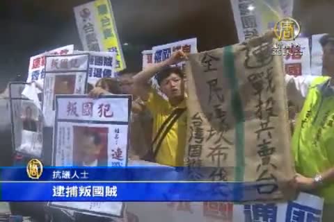 抗議人士:「連戰投共,賣台叛國,逮捕叛國賊,取消月退俸。」