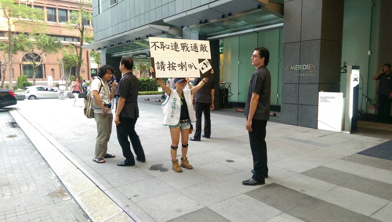 【新唐人亞太台 2015 年 09 月 05 日訊】連戰金婚宴,現場媒體大陣丈守候。根據記者回報,宴會在三樓舉辦,但上三樓手扶梯全被封掉,電梯進行人工管制,現場有台灣獨立黨共6人,舉標語抗議連戰通敵…