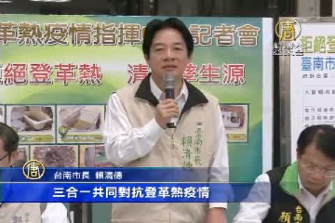 台南市長 賴清德:「面對登革熱的疫情,我一直認為,一定要中央政府跟地方政府攜手合作,同時市民也要全體總動員共同參與,三合一共同對抗登革熱疫情,才有辦法克盡全功。」
