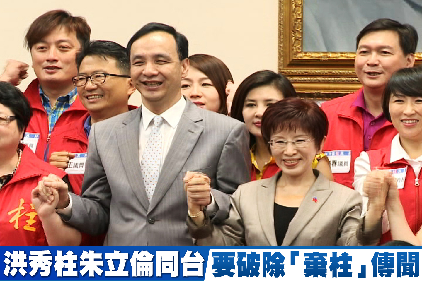 營造團結,國民黨造勢大會特地安排每人身穿一件,繡有「柱」字的紅色背心,象徵力挺洪秀柱。不過據傳,早先的中常會上,有中常委當朱立倫的面,痛批洪秀柱閉關卻不知反省,還要求換掉洪秀柱。人前喊團結,背後傳出「棄柱」,國民黨要粉碎謠言,恐怕沒那麼容易。