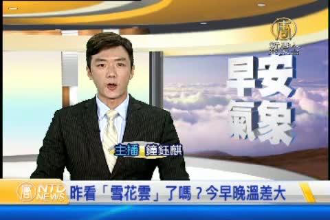 【新唐人亞太台 2015 年 09 月 10 日訊】歡迎您收看9月10日的早安新唐人,我是鐘鈺麒。先來帶您關心今天的天氣情況。觀眾朋友昨天是否有抬頭看看天空,發現像是一朵一朵雪花般的雲景,學名上來說,這是高積雲,代表水氣變多,天氣可能要變天了。今天,北部地區有機會下雨,各地白天高溫,則約在29到32度之間,不過,早晚溫差大,提醒早出晚歸的觀眾朋友,多加留意。帶您一起來看到國際媒體重要訊息。