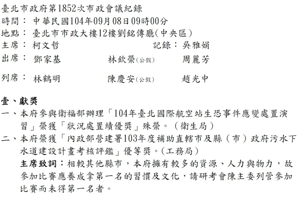 不過說到努力,柯文哲的考試拿第一哲學不僅對施政要繼續努力拼到第一,連市府單位參加競賽通通都要拿第一。9月8日的市政會議上,柯文哲對衛生局參加衛福部的「104年臺北國際航空站生恐事件應變處置演習」獲得「狀況處置績優獎」及工務局參加「內政部營建署103年度補助直轄市及縣市政府污水下水道建設計畫考核評鑑」獲得優等獎有話要說,柯文哲說:「相較其他縣市,臺北市擁有較多的資源、人力與物力,故參加比賽應養成拿第一名的習慣及文化,請研考會陳主委列管參加比賽而未得第一名者。」