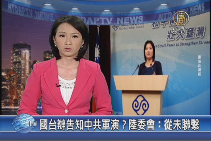 【新唐人亞太台 2015 年 09 月 10 日訊】今年7月,中共軍演出現 疑似模擬進攻台灣總統府的畫面,陸委會當時 曾透過聯繫機制,向中方表達嚴正抗議,那麼,中共國台辦這次是否有透過聯繫管道,告知陸委會明天要在台灣海峽舉行實彈射擊軍演?陸委會發言人吳美紅今天回應,說 陸委會和國台辦的溝通機制,從未溝通過這類事情。並表示,中共當局至今沒有放棄武力犯台,台灣應該要有自我防衛的決心和準備,政府也會持續舉辦演習和兵棋推演。