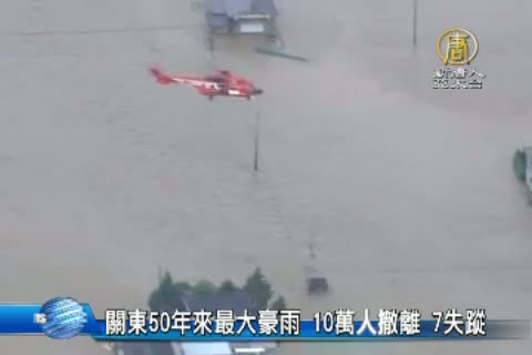 【新唐人亞太台 2015 年 09 月 11 日訊】早安新唐人先帶您關心,今年第18號颱風艾陶,為東日本帶來嚴重災情。關東地區遇上50年來最大豪雨,有10萬人撤離,7人失蹤。當地的「鬼怒川」溪水暴漲,壢木縣和茨城縣,有多處地方淹大水,從空拍畫面來看,許多民眾都在屋頂或陽台上,等待直升機救援,有房屋甚至被大水沖走,場面相當怵目驚心。