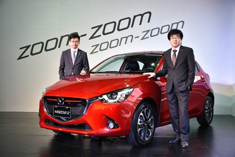 台灣馬自達總經理浜本俊輔與行銷部部長賴信宏為All-new Mazda2上市進行揭幕。(台灣馬自達提供)