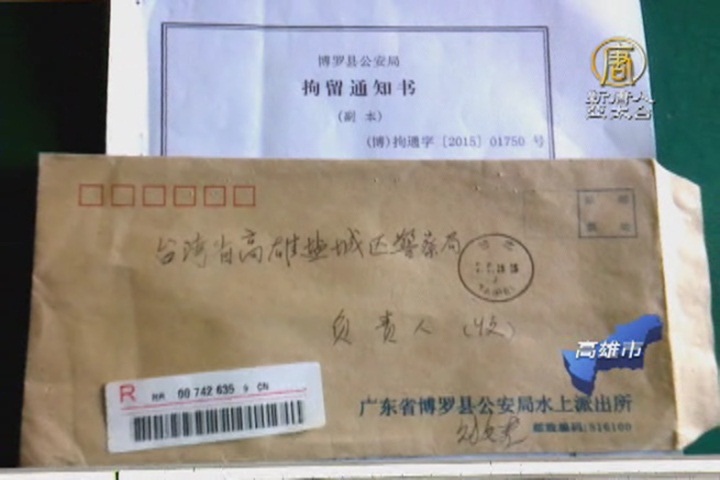 黃色的公文封,收件人部分連鹽埕分局的「埕」都寫錯,這封公文書,來自中國廣東省博羅縣公安局的水上派出所,是一份拘捕通知書的副本,裡面寫著在2015 年8月25日,抓到一名涉及刑案的台灣籍黃姓男子,要求高雄市警方,通知黃姓男子的家屬,但問題來了,中共公安憑什麼指揮台灣警察?
