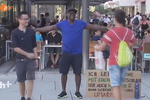 【新唐人亞太台 2015 年 09 月 13 日訊】來自中東和非洲的難民蜂擁而至,在德國柏林的情侶吉爾林與卡庫西,成立網站協助難民;有人在街頭徵求擁抱,展現德國對不同族裔的包容。