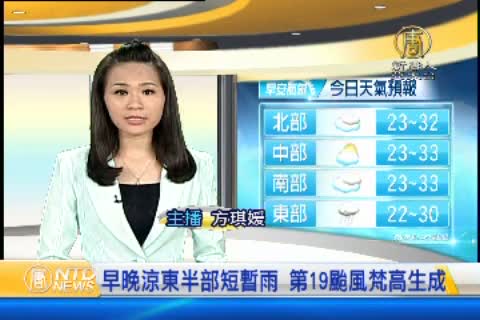 【新唐人亞太台 2015 年 09 月 14 日訊】歡迎您收看9月14日的早安新唐人,我是方琪媛。先來帶您關心今天的天氣情況。今天在東北風 影響下,東北部地區有短暫雨,午後中南部山區有局部短暫陣雨,白天氣溫會感覺有點悶熱, 西部地區高溫在32到33度、東部30度,不過早晚卻有些涼意。而位於南海的熱帶低氣壓已經在今天凌晨增強為今年第19號颱風梵高,預計會往越南方向前進,對台灣沒有影響,不過,另外一個位在北緯14度 東經152度附近,也有一個熱帶低壓持續發展,是否會增強為另一個颱風值得關注。帶您一起來看到國際媒體重要訊息。