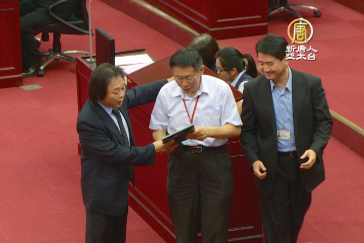 台北市長柯文哲今天赴台北市議會備詢,還沒上台就遭國民黨議員要求退回總預算,有人舉標語「退回總預算」,有人要「戴季全下台」。最後,柯文哲,收下了葵花寶典、小金庫等道具。