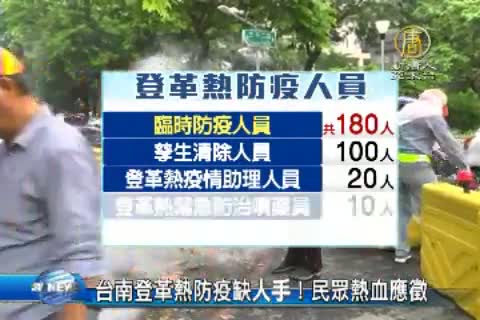 【新唐人亞太台 2015 年 09 月 16 日訊】台南市登革熱疫情持續延燒,台南市政府衛生局今天最新統計,全市達9103例,較昨天公布數據新增438例。因應登革熱疫情,台南市府公開招聘 包含孳生源清除工作員、登革熱噴藥人員等,180名短期臨時員工。