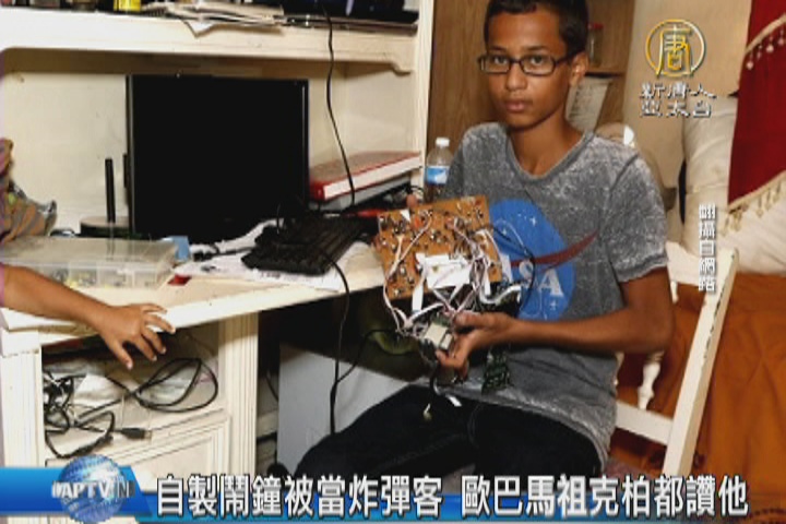 【新唐人亞太台 2015 年 09 月 17 日訊】美國德州的1名14歲穆斯林 男孩 艾哈邁德,日前帶了用鉛筆盒改造的自製時鐘到學校,結果被校方當成炸彈報警,小男孩還被上了手銬。消息傳開後,不少名人都對艾哈邁德的科學天份極為讚賞,美國總統歐巴馬就在推特上表示,很酷的時鐘,邀請艾哈邁德帶著他的鬧鐘來白宮,臉書創辦人祖克柏也在推特上表示,有能力打造這麼酷的發明,應該得到掌聲而不是噓聲。雖然事後證明艾哈邁德的清白,但還是引起美國社會對於種族歧視的議論。