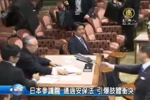 【新唐人亞太台 2015 年 09 月 17 日訊】日本備受爭議的安保法案,今天下午,在參議院特別委員會自民黨和公民黨的多數優勢下,強行通過。雙方議員爆發口角及肢體衝突,場面相當火爆。由於執政聯盟占參議院過半席次,因此,法案很可能在明天直接通過。在野黨則計劃,提出內閣不信任案,全力阻止參議院通過安保法。