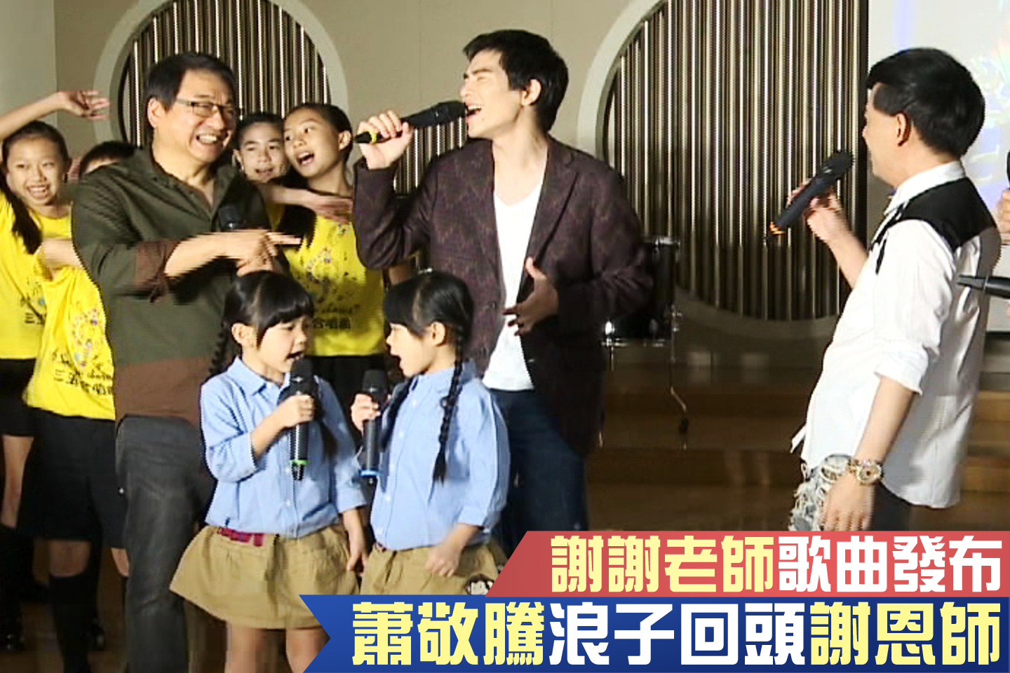【新唐人亞太台 2015 年 09 月 17 日訊】金曲歌王蕭敬騰、黃子佼、左左右右出席《謝謝老師》歌曲發表會,蕭敬騰在歌曲中獻聲演唱,也在現場感謝,初中時的校外音樂老師,儘管因為家境的關係,繳不出學費,仍然願意免費讓他學習音樂。