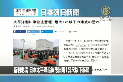 【新唐人亞太台 2015 年 09 月 18 日訊】來看到日本朝日新聞報導:智利地震 日本太平洋沿岸恐出現1公尺以下海嘯