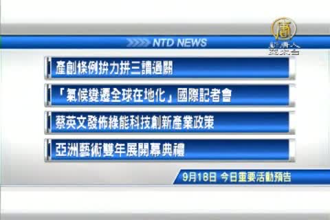 【新唐人亞太台 2015 年 09 月 18 日訊】接著看到,今天,9月18日,星期五,有哪些重要活動。產創條例力拚今天在立法院三讀過關;再來是,環保署「氣候變遷 全球在地化」國際記者會; 民進黨總統參選人蔡英文發佈綠能科技創新產業政策,以及 ,亞洲藝術雙年展開幕典禮。