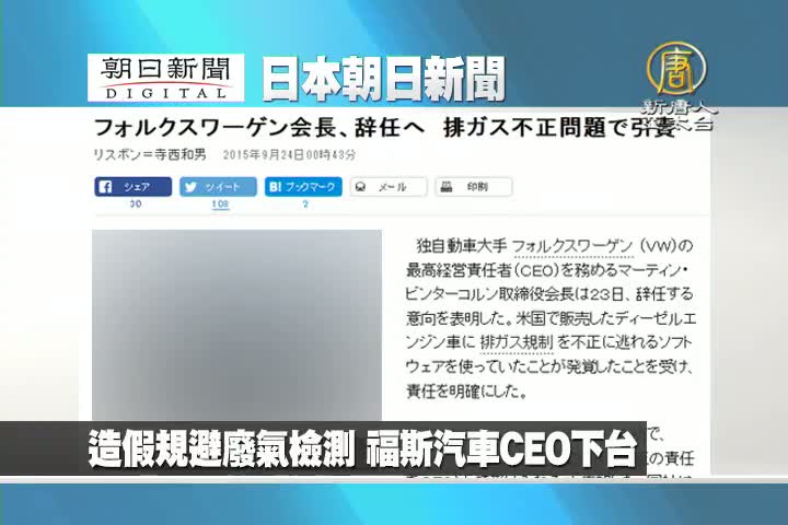 【新唐人亞太台 2015 年 09 月 24 日訊】來看到日本朝日新聞報導:造假規避廢氣檢測 福斯汽車CEO下台