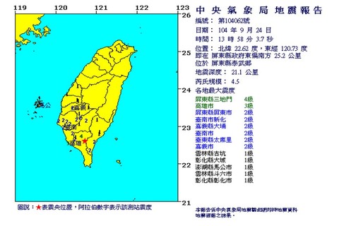 【新唐人亞太台 2015 年 09 月 24 日訊】13:58屏東規模4.5地震 震度最大4級