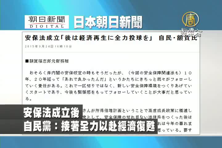 【新唐人亞太台 2015 年 09 月 25 日訊】來看到日本朝日新聞報導:安保法成立後 自民黨表示接著全力以赴經濟復甦