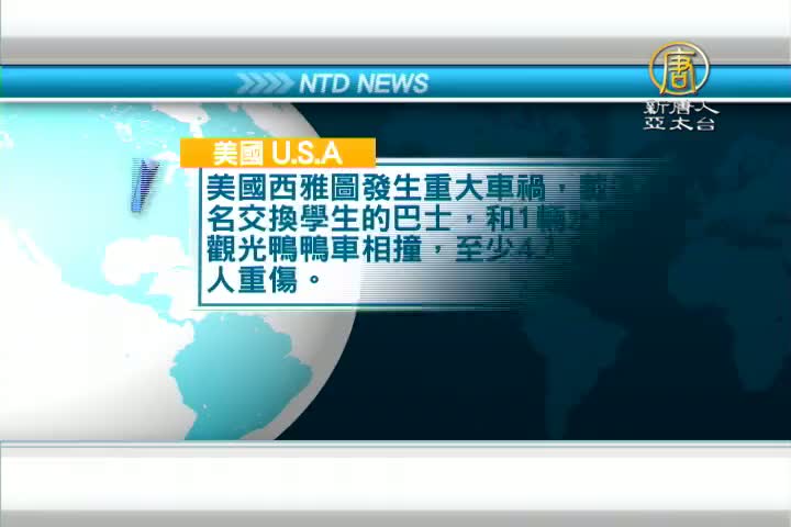 美國西雅圖發生重大車禍,載運6國48名交換學生的巴士,和1輛水陸兩用的觀光鴨鴨車相撞,至少4人喪生,和12人重傷。