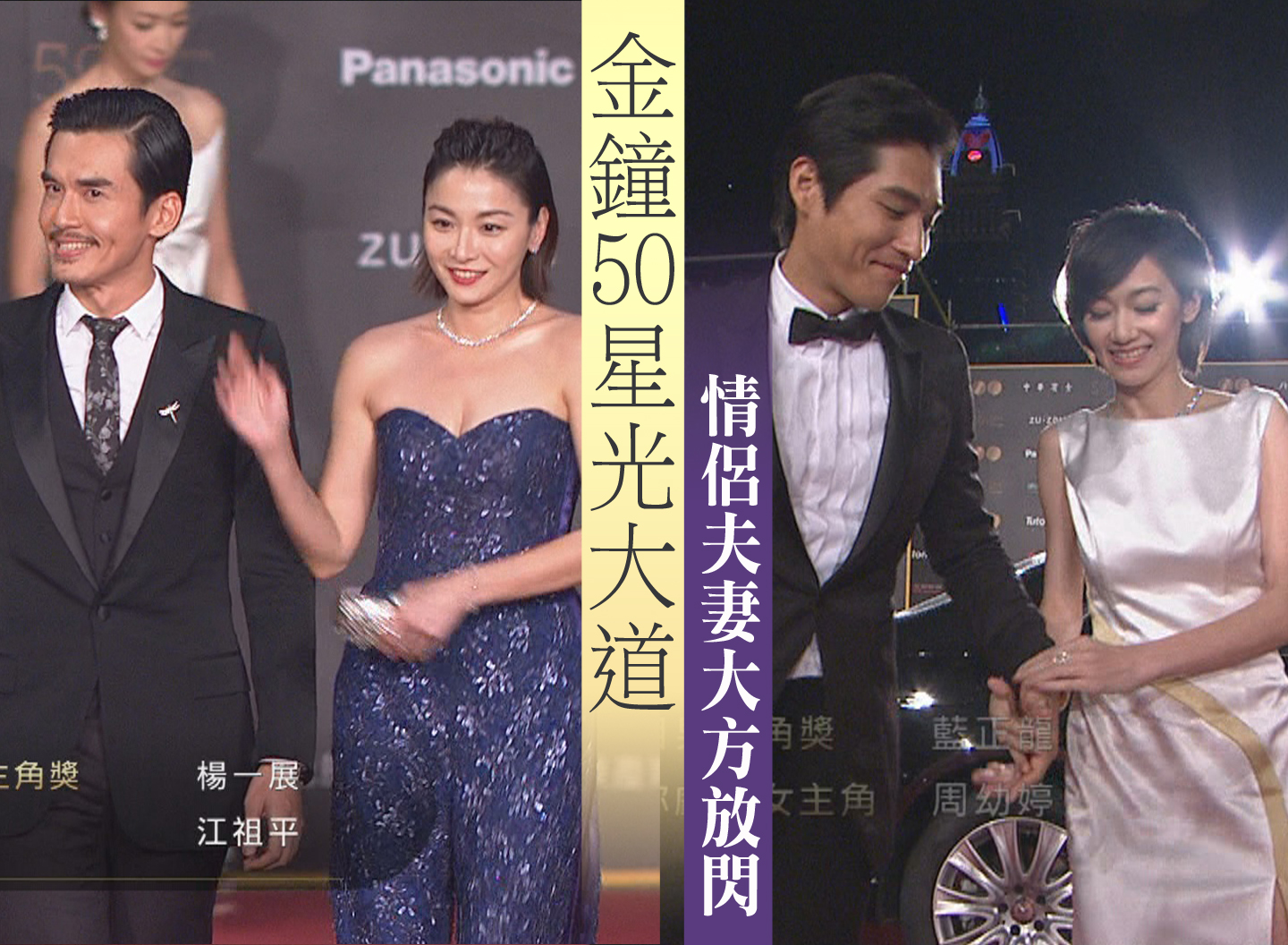 【新唐人亞太台 2015 年 09 月 26 日訊】第50屆金鐘獎頒獎典禮今天(26日)登場,紅毯上女星爭奇鬥艷,情侶檔夫妻檔也成為另一焦點,爭奪影帝的楊一展與女友江祖平牽手合體亮相,還有另一位影帝入圍者藍正龍,今年喜獲愛女也與老婆周幼婷牽手走紅毯,大方放閃。