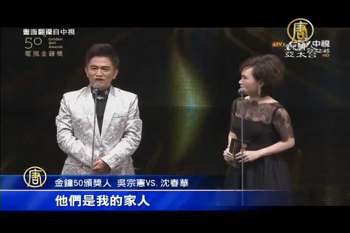 金鐘50頒獎人 吳宗憲VS.沈春華:「她拿過13座金鐘獎,她等於是我們主持界的江蕙,不得了,所以今天找她跟我一起來頒獎,你們是故意要氣我對不對。他們大部分都是業界非常資深的前輩,應該也都是你的好朋友吧,他們不是我的朋友,宗憲宗憲…,這樣說這樣說,不太好吧,他們是我的家人。」
