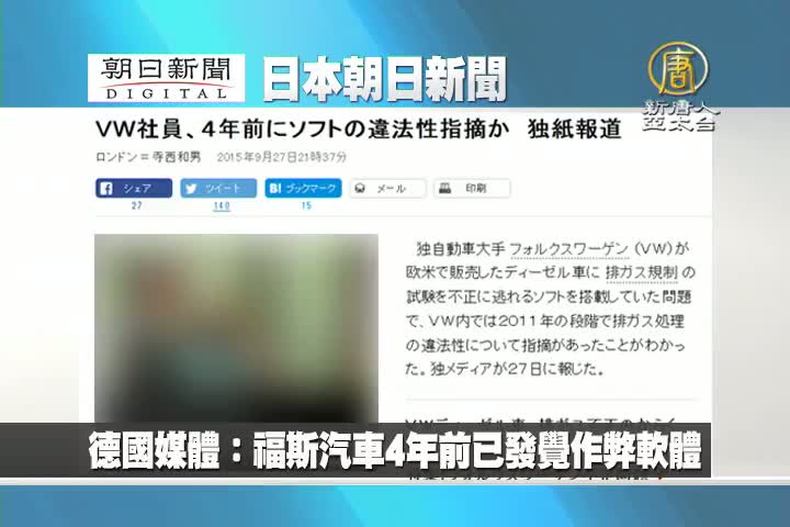 【新唐人亞太台 2015 年 09 月 28 日訊】來看到日本朝日新聞報導:德國媒體報導 福斯汽車4年前已發現作弊軟體。