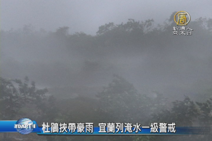 【新唐人亞太台 2015 年 09 月 28 日訊】強颱杜鵑已在下午5時40分於宜蘭南澳登陸,挾帶狂風豪雨,宜蘭地區首當其衝,水利署宣布將宜蘭縣冬山鄉 列為淹水一級警戒,帶您看到宜蘭稍早畫面。