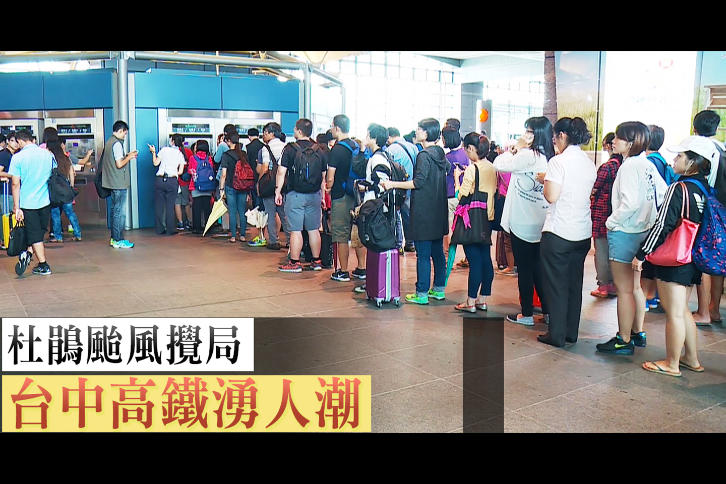 【新唐人亞太台 2015 年 09 月 28 日訊】時間回到稍早白天的時候,今天是中秋連假最後一天,碰上杜鵑颱風來攪局,打亂整個交通,高鐵緊急宣布 下午三點發車後,全線停駛。一早,新烏日高鐵車站擠滿返鄉人潮,民眾提著大包小包,排滿自動售票口。