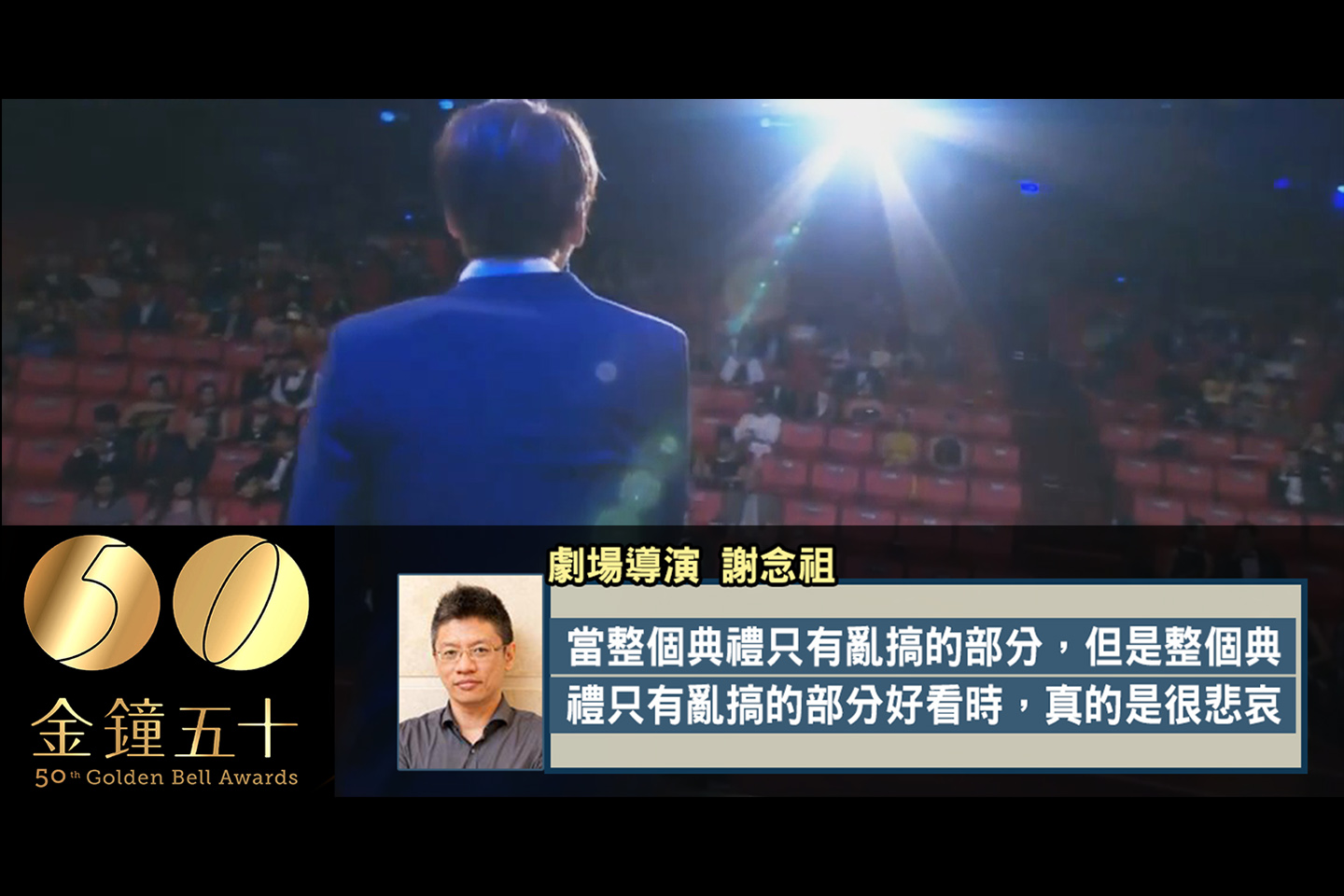 歌手信金鐘典禮台上獻歌藝,但導播一個旋轉運鏡,卻帶出台下觀眾大多不在座位上,劇場導演謝念祖在臉書發文,指出金鐘50典禮缺失。