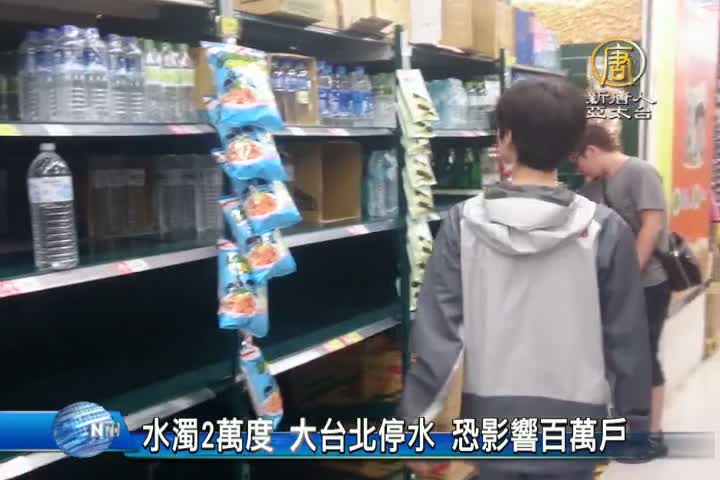 【新唐人亞太台 2015 年 09 月 29 日訊】杜鵑颱風來襲,山區大量降雨,讓新店溪濁度飆升,昨天晚間最高濁度已經突破2萬度。目前,雙北已經有19萬用戶停水,如果今天下午四點半之前,北水處仍然無法取水,雙北一百五十三萬戶,將陷停水危機。