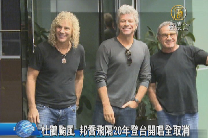 【新唐人亞太台 2015 年 09 月 29 日訊】受到颱風影響的還有 美國搖滾天團「邦喬飛」,暌違20年來台灣演唱,卻遇杜鵑颱風攪局,唯一兩場的演唱會全部都被取消,不過,因為台北市已經無風無雨了,不少台灣粉絲希望邦喬飛改變心意,今晚開唱,但據了解,後台技術人員已經先離台,邦喬飛預計在今天下午3點,搭乘私人飛機,由松山機場離台。