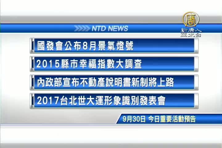 【新唐人亞太台 2015 年 09 月 30 日訊】接著看到,今天,9月30日,星期三,有哪些重要活動。國發會公布8月景氣燈號。2015縣市幸福指數大調查。內政部今天將宣布,不動產說明書新制上路。另外,2017台北世大運形象識別發表會。