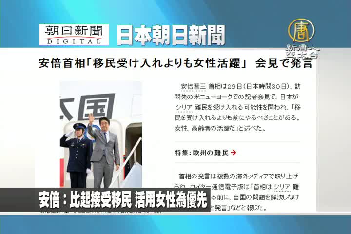【新唐人亞太台 2015 年 10 月 01 日訊】來看到日本朝日新聞報導:安倍晉三表示 比起接受移民 活用女性為優先